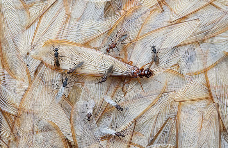 Победителем в категории «Крылатые» стал фотограф Пётр Наскрецки со своей фотографией мелких насекомых, которых он запечатлел в Мозамбике. Большинство термитов в жаркой Африке не имеют ни крыльев, ни глаз и живут под землей. Но всего раз в году королева-термит производит крылатых термитов. С первым дождём после засухи они массово выбираются на поверхность земли. «Как только они перестают летать и приземляются, насекомые начинают искать себе партнёра, и в процессе их крылышки отваливаются. В течение дня вся земля покрывается этими крыльями. На фотографии видно, что теперь по этим крыльям ходят и другие насекомые — в моём случае это были крылатые муравьи», — подметил фотограф.