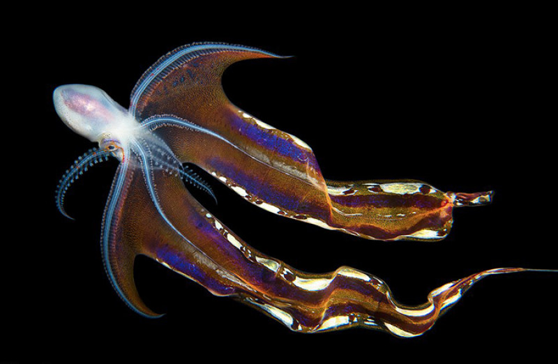 Одним из финалистов категории «Подводная жизнь» стал снимок Джигонг Ханга. На фотографии запечатлена женская особь осьминога. У этой разновидности сильный половой деморфизм: самцы вырастают в длину около 15 миллиметров, в то время как самки достигают 2 метров.