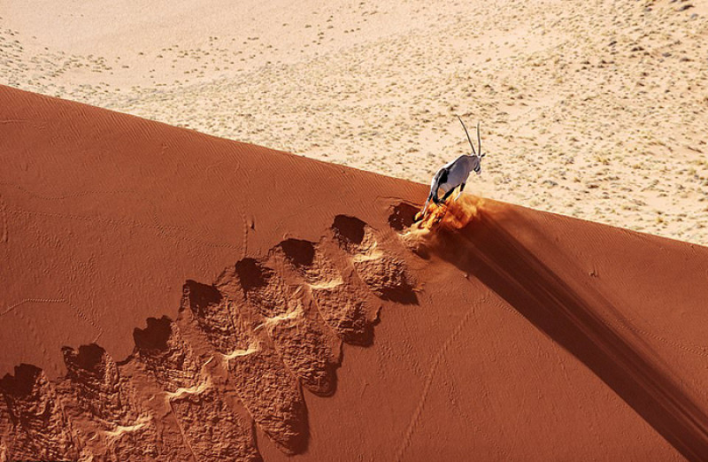 Одним из самых комментируемых снимков на конкурсе стал кадр с сернобыком в пустыне Намиб. Животное прыгало по красной дюне, скатываясь по песку, но все-таки сумело добраться до вершины дюны. По другую сторону вершины сернобык сможет найти прохладный ветерок Атлантического океана.