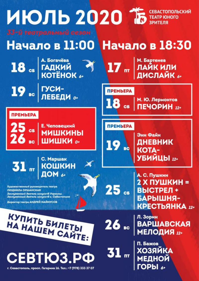 17 июля в Севастопольском театре юного зрителя стартует 33-й театральный сезон. В этот день вас ждёт спектакль для семейного просмотра «Лайк или дислайк», 6+. Кроме того, в июле юные театралы увидят сказку «Мишкины шишки» — с новыми костюмами, декорациями и обновленным актёрским составом.