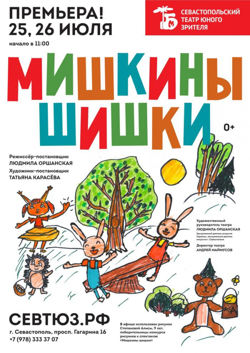 А уже в эти выходные, 25 и 26 июля, Севастопольский ТЮЗ представит сказку «Мишкины шишки» (0+) в постановке художественного руководителя театра, режиссёра Людмилы Оршанской.