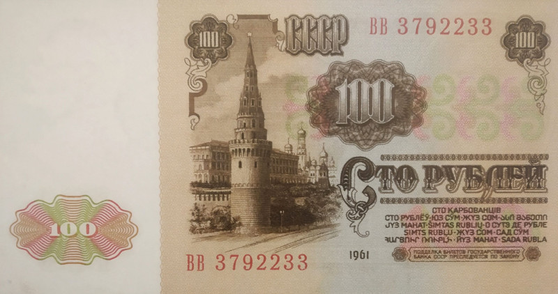 На выставке представлена и репродукция сторублёвой банкноты нового образца, которая появилась в СССР в 1961 году. Её разработали художники Гознака — Юрий Лукьянов и Иван Дубасов. Портрет Ленина на лицевой стороне купюры сделан со скульптуры авторства Николая Соколова. На оборотной стороне банкноты, на ее переднем плане, — Водовозная башня Кремля.