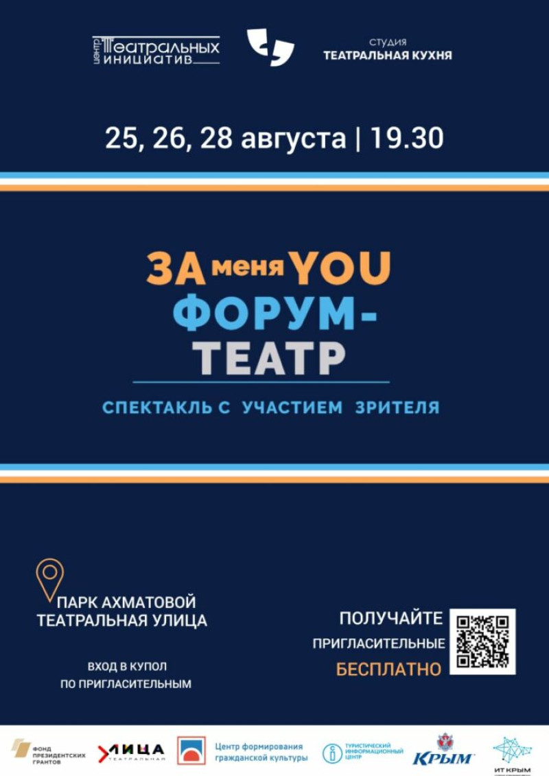 25,26 и 28 августа в 19:30 в куполе «Театральной улицы» состоится еще одно интереснейшее мероприятие — спектакль «ЗАменяYOU». Это будет интерактивная постановка, в которой каждый зритель сможет заменить актёра и сыграть роль. Как рассказала организатор события Наталья Слепченко, «ЗАменяYOU» — это экспериментальный спектакль, сделанный по методу форум-театра.