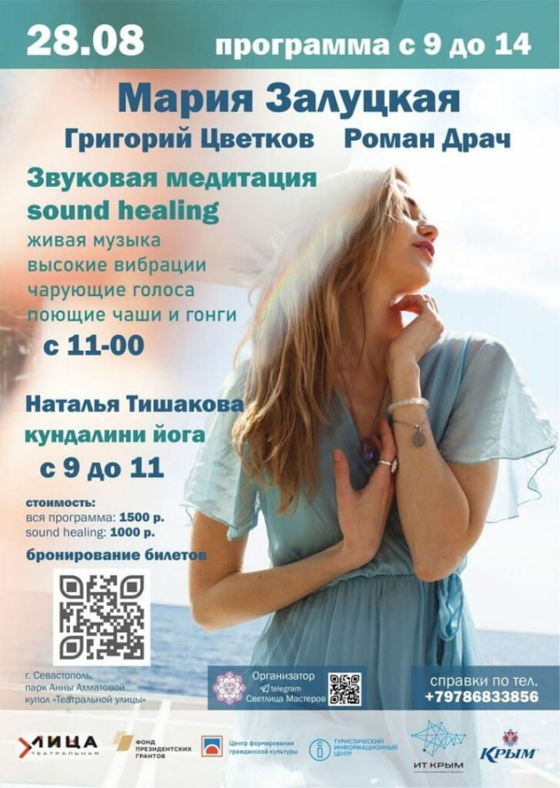 А в первую половину дня, с 09:00 до 14:00, состоится звуковая медитация sound healing. Её проведут для всех желающих Мария Залуцкая — духовный проводник, трансформатор сознания, квантовый энерготерапевт, а также её команда — Григорий Цветков и Роман Драч. Вас ждут живая музыка, чарующий голос, поющие чаши и гонги, мистический ханг и фортепиано. Стоимость посещения варьируется от 500 до 1500 рублей в зависимости от того, какую именно часть программы вы хотите посетить — кундалини-йогу, звуковую медитацию sound healing или все вместе. Регистрация на мероприятие осуществляется по ссылке https://inlnk.ru/G6Ax9w. Контакты для связи: +7 (978) 683-38-56.