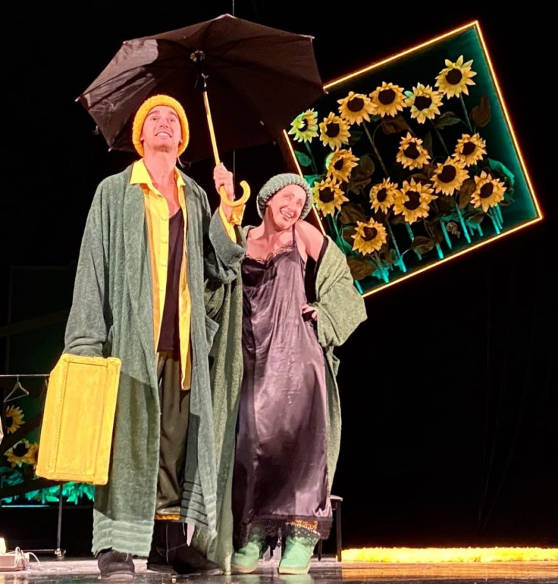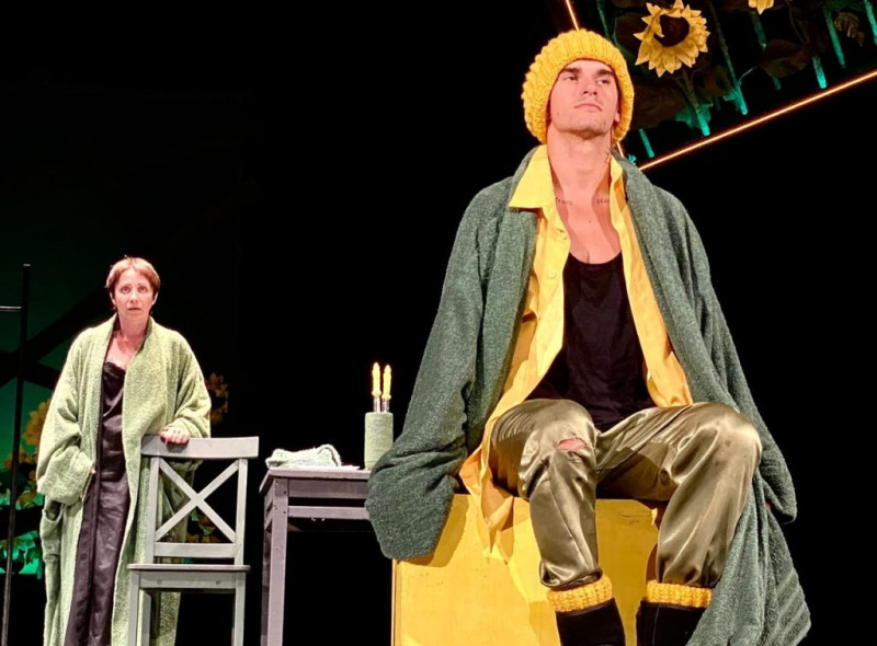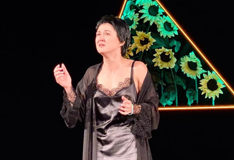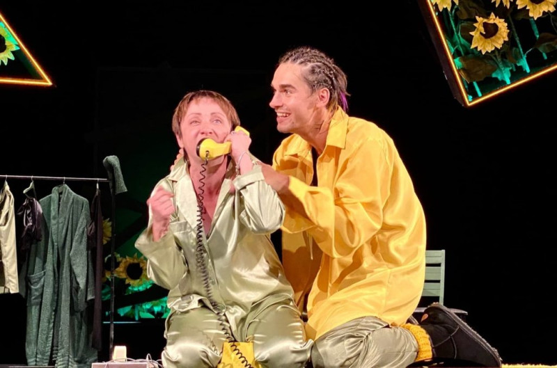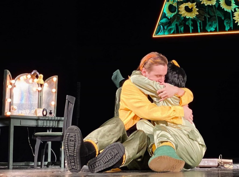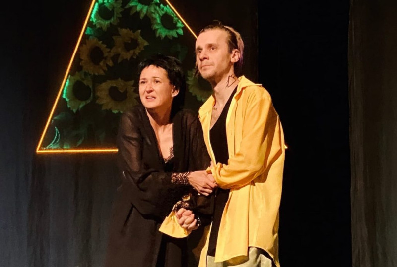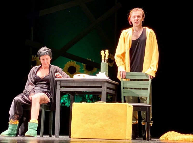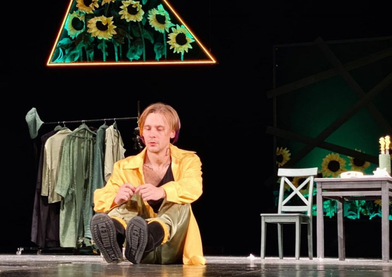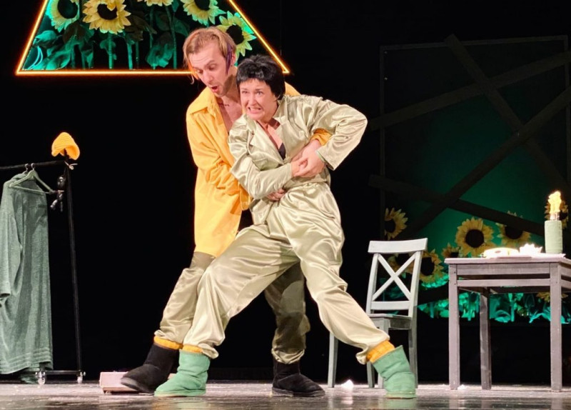 Ну а подсолнухи, на которых Уильямс делает в пьесе особый акцент, в постановке Григория Лифанова становятся камертоном всего действа, определяя и цветовую нагрузку спектакля, и его эмоционально-психологический фон. Заключённые в треугольную и квадратную рамки, подсолнухи словно парят над сценой, концентрируя на себе взгляд и заставляя сознание переходить с одного витка ассоциаций на другой.
