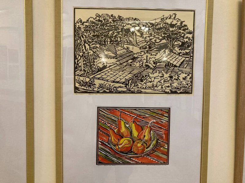 Одна из работ — «Мастерская резчика по дереву» — изображает двор художницы, где её муж устроил самодельный станок и точил огромное блюдо из шелковицы.