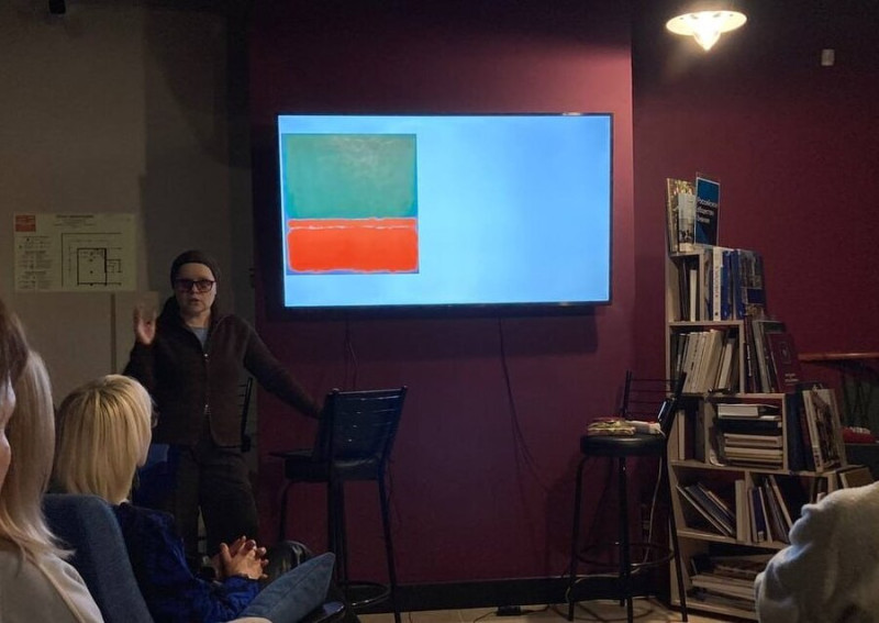 Затем лектор перешла к беспредметной живописи американского абстракциониста Марка Ротко, на полотнах которого изображены яркие локальные цвета. На примере одной из его работ Горенкова продемонстрировала, как с помощью цветовых нюансов художник добивается эффекта покоя, сталкивая при этом контрастные цвета: красный и зелёный. По словам искусствоведа, всё дело в специальной красной полосе, которую Ротко поместил на специальную подложку.