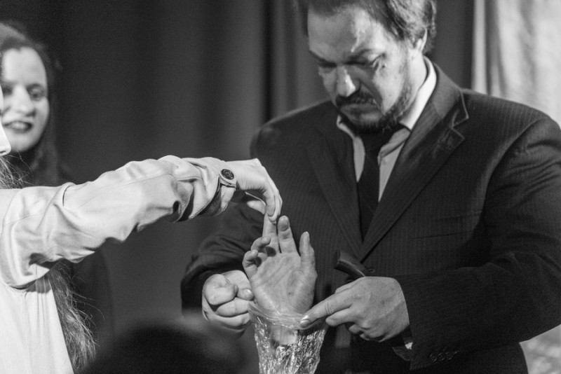 Мужчина начинает кашлять, хватается за горло и «падает» на пол. Из-за «кулис» тут же выбегает женщина, администратор и по совместительству автор пьесы, по которой поставлен спектакль. Она взволнованно подбегает к лежащему и продолжающему заходиться кашлем мужчине, интересуется его здоровьем, пытается выяснить, может ли чем-то ему помочь.