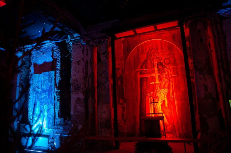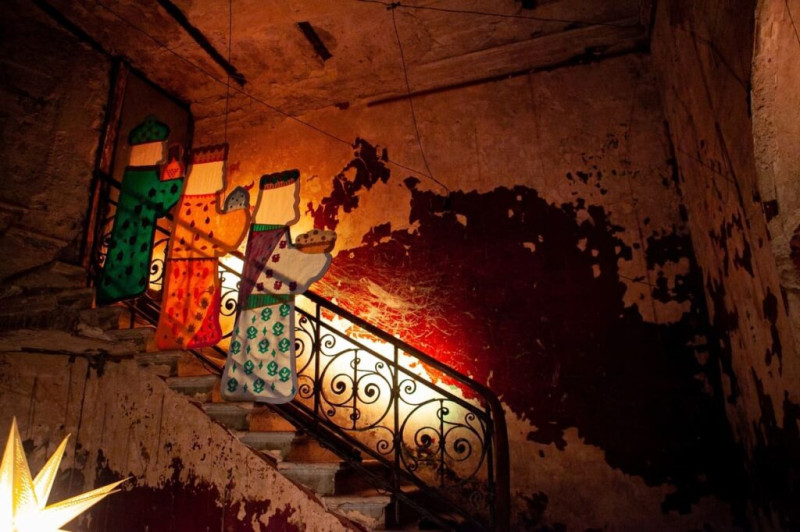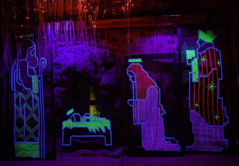 Лестница, ведущая на балконы, отсылает к истории волхвов, а на втором этаже посетители попадают в пещеру Рождества. Сам вертеп выполнен креативно и необычно. Организаторы выставки провели творческий конкурс, на который принимались авторские версии вертепа для Анненкирхе. Победителем стала Алёна Зуева – она вышила неоновыми нитями святое семейство на сетке обычного забора.