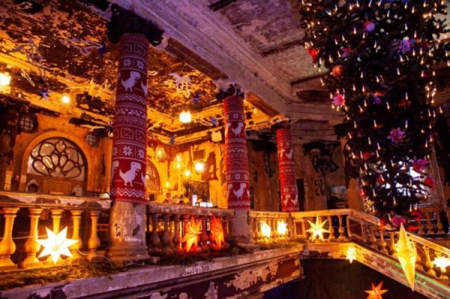В большом зале вырос хвойный лес из 500 елей. Колонны здания украсили изображением вязанных свитеров, лампы заменили на гирлянды в виде Вифлеемских звёзд.