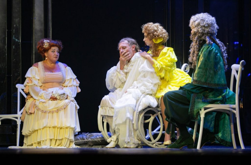 «Мнимый больной» Григория Лифанова – этот как раз тот случай, когда в постановке срабатывает всё: и заразительно-яркие актёрские работы молодой гвардии, и жизнерадостные костюмы (Ника Брагина) и размах декораций с бережным отношением к эпохе (художник Наталья Лось), и музыка, без которой лечебно-профилактические свойства спектакля были бы не такими сильными. Кстати, аранжировки с любовью и знанием дела написал Евгений Журавкин.