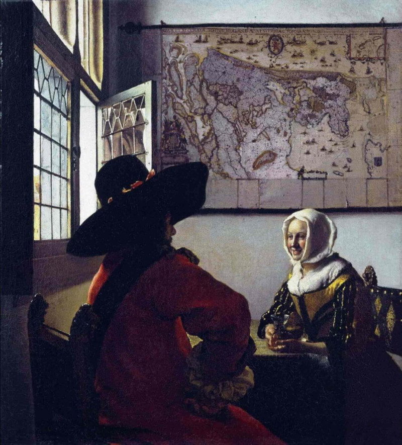 Вермеера я называю настоящим сюрреалистом XVII века. Но не разбавлено-помидорный и ванильный, как Сальвадор Дали, не поверхностный, а настоящий, глубинный. Меня охватила дрожь перед этой картиной от силы ее воздействия. Ее реализм находится на какой-то другой, непостижимой ступени. Казалось бы, банальный сюжет: офицер приходит в голландский дом терпимости; за столом сидит милая девушка; на нее из окна, как всегда у Вермеера, льется свет; на стене карта. И сразу понятно: офицер ездит по разным странам, по весям, приехал в этот город и… пошел к девочке. Чего проще! Но сквозь этот простой мир проглядывает такая сюрреалистическая баллада…