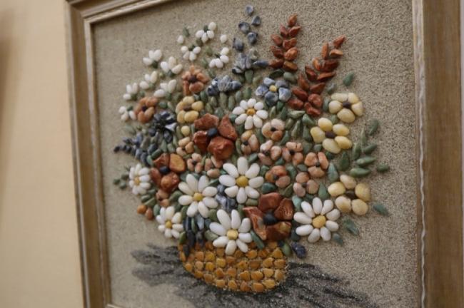 В своей новой выставке Татьяна Умнова показывает, что искусство можно создать и из маленьких камешков. Камни и песок с морских берегов Севастополя и Крыма превратились в хризантемы, розы, ландыши и другие цветы. А для первых работ художница использовала ракушки. Помимо цветочных композиций на выставке можно увидеть пейзаж из камня, а всего в экспозиции представлено свыше 40 работ.