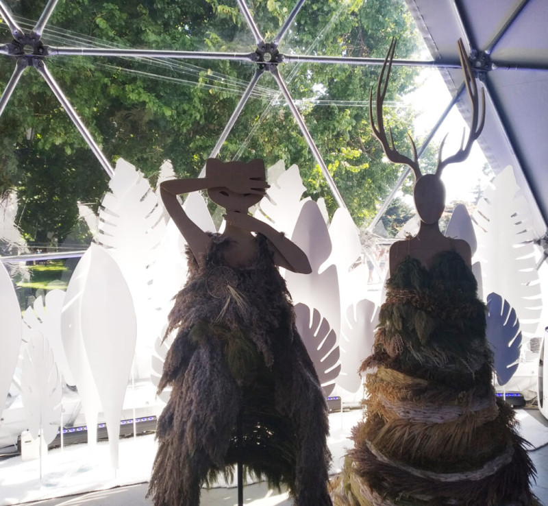 Природные материалы использованы ещё в нескольких работах автора: платье «Дикое лето» и фраке «Лесные дали», созданных из трав и волокон переработанных пластиковых бутылок. Сейчас это экспонаты выставки, а вскоре они будут использованы в театральной постановке.