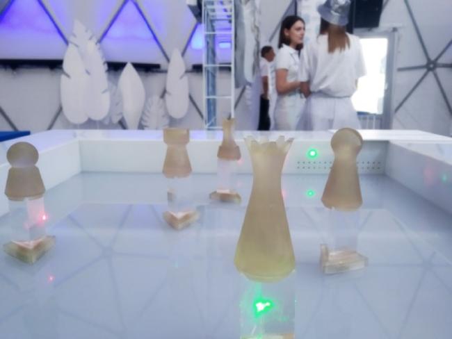 Представленные на выставке оптические шахматы — экспериментальный тип логической игры с шестью фигурами. В этой игре «шахматные фигуры» — прозрачные призмы. Их необходимо не двигать, а поворачивать, отражая свет направленных на них лазеров. Задача игрока — просчитать направление лучей, отражающихся от поверхностей прозрачных призм, и попасть ими на небольшие круги, расположенные на бортах корпуса. Внутри этих корпусов находятся фотоприёмники. Если игрок правильно просчитал позиции призм, то есть три луча попадают на три фотоприёмника, звучит мелодия.