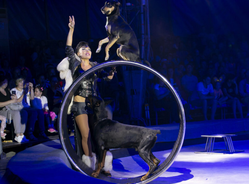 — Дрессировщица, заслуженная артистка России Ольга Ван Ю Ли создала новый номер с доберманами. Эта порода в цирке представлена впервые! Ольга выступает с мужем Сергеем Стрелецким. Оба — лауреаты международных конкурсов.