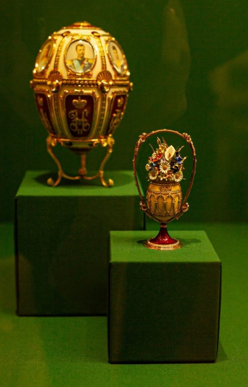 Среди экспонатов – яйцо, выполненное к 10-летию свадьбы Николая II и Александры Фёдоровны и яйцо, подаренное вдовствующей императрице Марии Фёдоровне. Также на выставке представлена миниатюрная копия императорских регалий, созданная для парижской Всемирной выставки 1900 года.