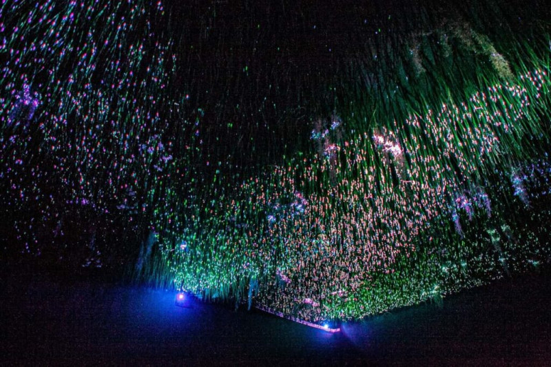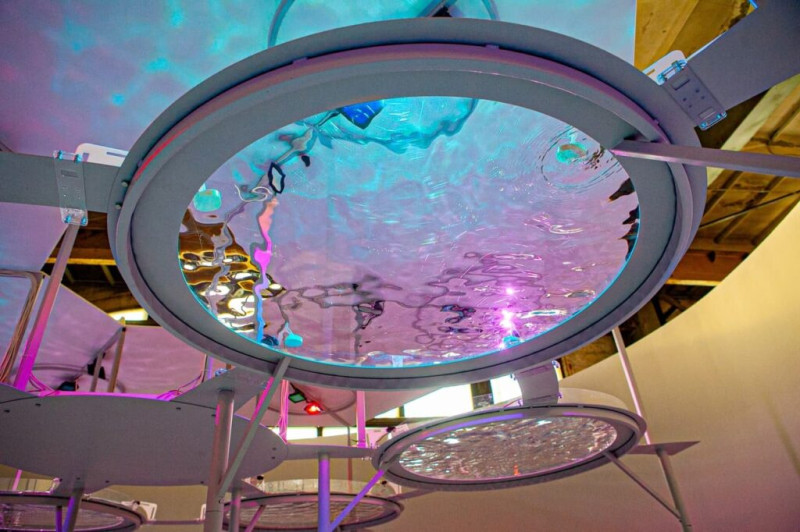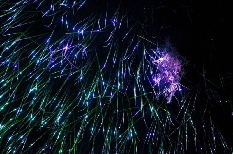 Самая эффектная инсталляция представляет луг под потолком, состоящий из светящихся проводков-травинок, которые колышутся под звуковые и световые эффекты.