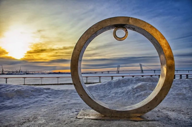С берега открывается прекрасный вид на Финский залив, где в металлическое кольцо можно поймать заходящее солнце (см. заглавное фото).