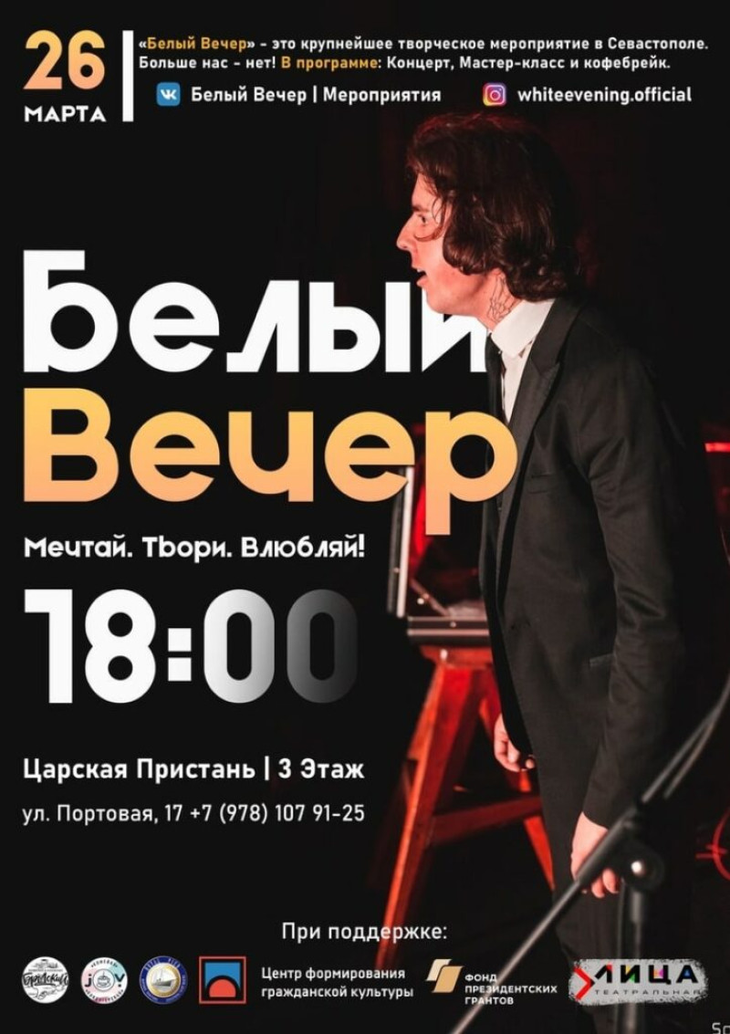 Кроме этого, 26 марта, в Севастополе вновь состоится «Белый вечер». Мероприятие начнётся в 18:00 и пройдёт в бизнес-центре «Царская пристань» по адресу ул. Портовая, 17. Гостей события ждёт безумная феерия творческой мысли, человеческого тепла и фантастического единства. Незаинтересованных в концертной части мероприятия организаторы порадуют мастер-классами и интерактивами. Узнать стоимость билета, условия покупки и зарегистрироваться на мероприятие можно в сообществе события в соцсети «ВКонтакте».