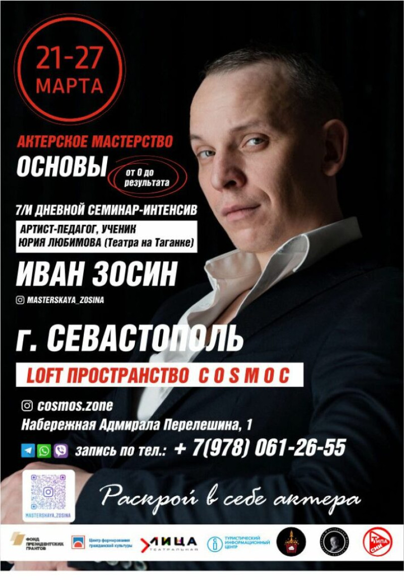 Жители и гости Севастополя, которые давно мечтали овладеть актёрским мастерством, могут записаться на семидневный семинар-интенсив. Он будет проходить в городе с 21 по 27 марта. Его проведёт артист, ученик Юрия Любимова, музыкант, преподаватель, режиссёр Иван Зосин.
