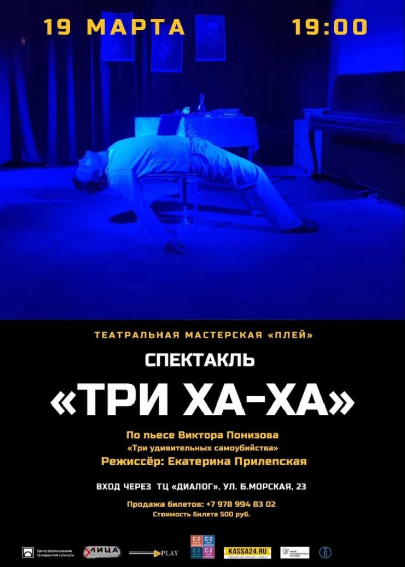 Уже в эту субботу, 19 марта, в арт-пространстве «Глубина» по адресу ул. Большая Морская, 23 (вход через ТЦ «Диалог») состоится спектакль «Три ха-ха» по пьесе Виктора Понизова «Три удивительных самоубийства». Зрителей ждёт моноспектакль о жизни маленького человека-неудачника, который очень хотел стать большим. Хотя бы из жизни он хотел уйти красиво, но судьба распорядилась иначе.