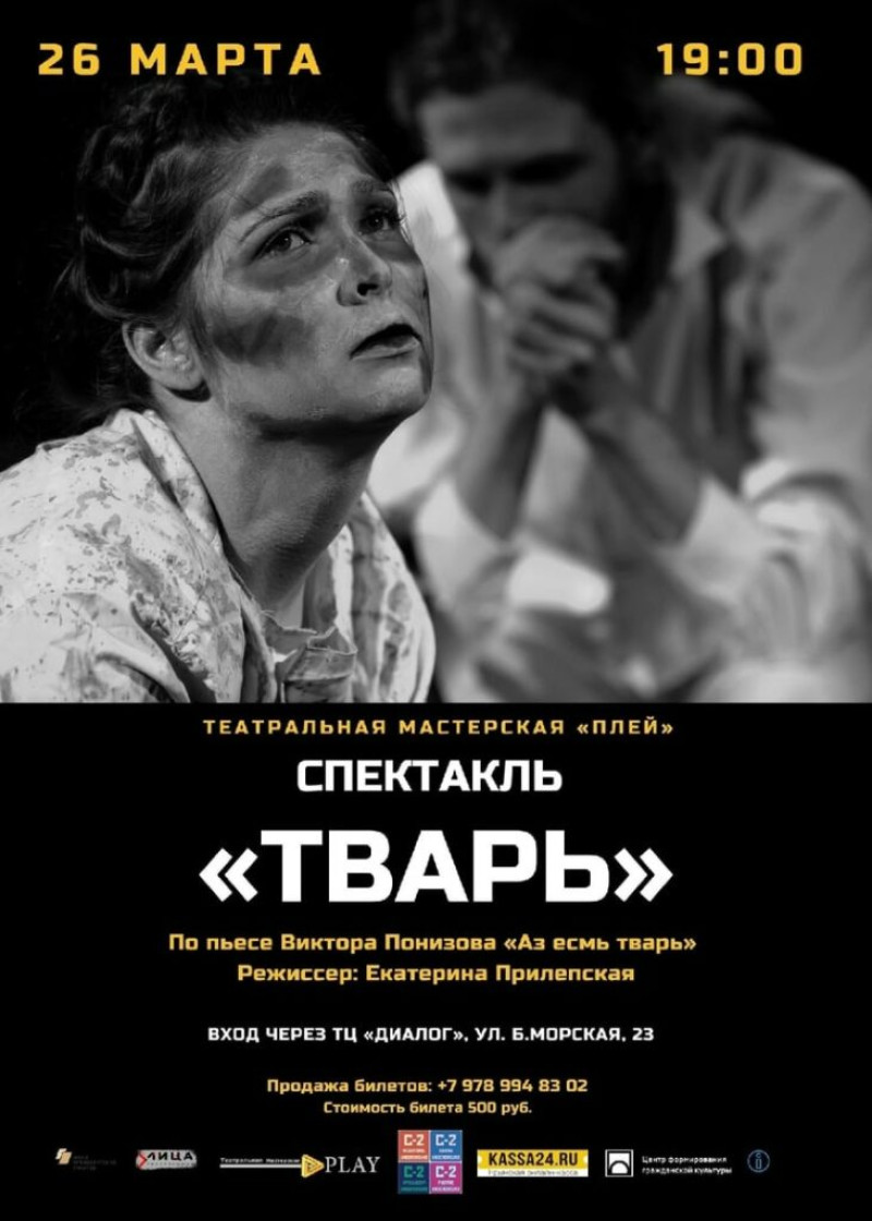 Ещё один спектакль от Театральной мастерской PLAY – «Тварь» – пройдёт в арт-пространстве «Глубина» на следующей неделе, 26 марта. Это будет постановка по пьесе Виктора Понизова «Аз есмь тварь». Спектакль был поставлен в 2016 году, а в 2017-м победил на фестивале малых театральных форм «Закрытый показ» в двух номинациях: «Прорыв года» и «Лучшая женская роль».