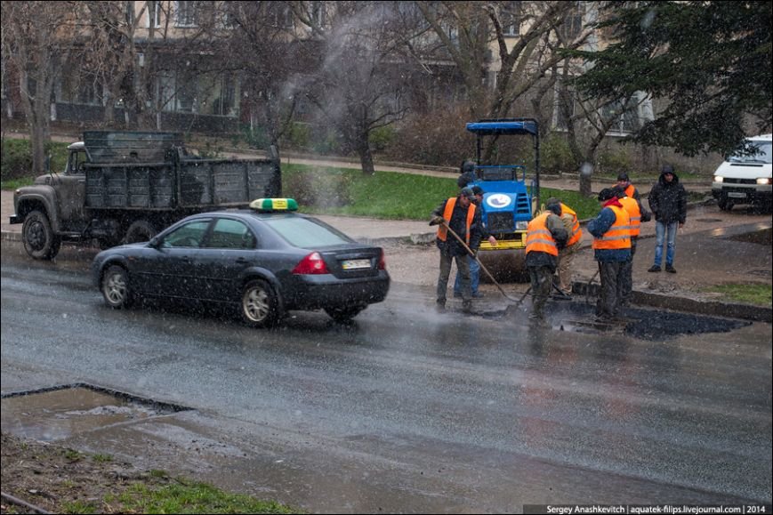 Асфальт вперемешку со снегом или как ремонтируют дороги зимой!!! Нужно, чтобы дорожные службы давали гарантию на выполняемые работы, тогда не будут асфальт со снегом укладывать. Да и общественный контроль тоже никто не отменял. В Севастополе «научились» укладывать асфальт во время мокрого снегопада. Пока один рабочий вычерпывает растаявший снег из ямы лопатой, второй быстро набрасывает горячий асфальт, пока вода не успела стечь обратно. И тут же разравнивают асфальт вперемешку с водой в яме. Снимки таких дорожных работ в своём блоге разместил известный крымский путешественник и фотограф Сергей Анашкевич. По его информации, фото сделаны 30 декабря 2014 года на улице Вакуленчука в г. Севастополе. За неделю до этого рабочие закончили полную замену дорожного покрытия, уложив совершенно новый асфальт. «Дорожники зачем-то раздолбили вокруг решеток ливневой канализации положенный неделю назад по всей улице асфальт и торопятся залатать эти участки», — пишет Анашкевич. «Понятно, что они выполняют указание начальника. Но, он то разве не понимает, что класть новый асфальт фактически под дождем все равно, что выбросить деньги на ветер?» — спрашивает автор фото.