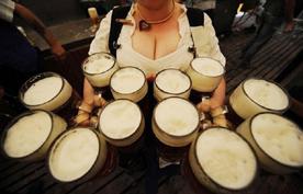 Пиво соедините с водой, приправьте по вкусу солью, дайте жидкости закипеть, после чего уменьшите огонь и варите около получаса. Тем временем, слепите из телячьего фарша фрикадельки и отварите их в свекольном отваре или воде. Готовые фрикадельки положите в пивной суп, и сразу же подавайте к столу со стаканом пива