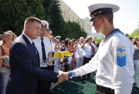 Командующий дал наказ служить добросовестно, быть настоящими профессионалами и образцом для подчиненных, дорожить офицерской честью и достоинством, беречь и приумножать традиции флотского братства, любовь к Родине, своему кораблю, своей воинской части. Вице-адмирал Юрий Ильин пожелал выпускникам успехов в овладении должностями, уверенности в своих силах, традиционных чистых фарватеров и семь футов под килем.
