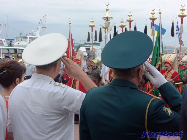 Но обо всём по порядку. В 16:30 под звуки нескольких сотен музыкальных инструментов из 6 стран в распогодившееся после дождя севастопольское небо взметнулись государственные флаги стран-участниц Севастопольского фестиваля «Милитару Татту». Такого зрелища на Украине нет больше нигде! Только в городе-герое Севастополе, флаг которого тоже был поднят на центральном флаг-штоке Графской пристани. Здесь и проходила церемония его открытия. На деревянной «палубе» лицом к горожанам были построены все десять оркестров.