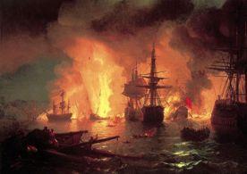 В ходе русско-турецкой войны 1768-1774 гг. завершилось Чесменское морское сражение. Русский флот (9 линейных кораблей, 3 фрегата и др. суда, всего 820 орудий) под командованием графа А.Г. Орлова (фактически командовал адмирал Г.А. Спиридов) 5 июля атаковал в Хиосском проливе, северо-западнее г. Чесмы, турецкий флот (16 линейных кораблей, 6 фрегатов, до 50 малых судов, всего 1430 орудий). Турецкая эскадра, в беспорядке отступив в Чесменскую бухту, была заблокирована русской эскадрой. В ночь на 7 июля отряд русских кораблей под командованием контр-адмирала С.К. Грейга вошел в бухту, с помощью брандеров поджег часть турецких кораблей, а затем артиллерийским огнем довершил разгром противника. К утру сгорел весь турецкий флот за исключением 1 линейного корабля и 5 галер, захваченных в плен. Турки потеряли убитыми и ранеными около 11 тыс. человек. Потери русских – 661 убитых.