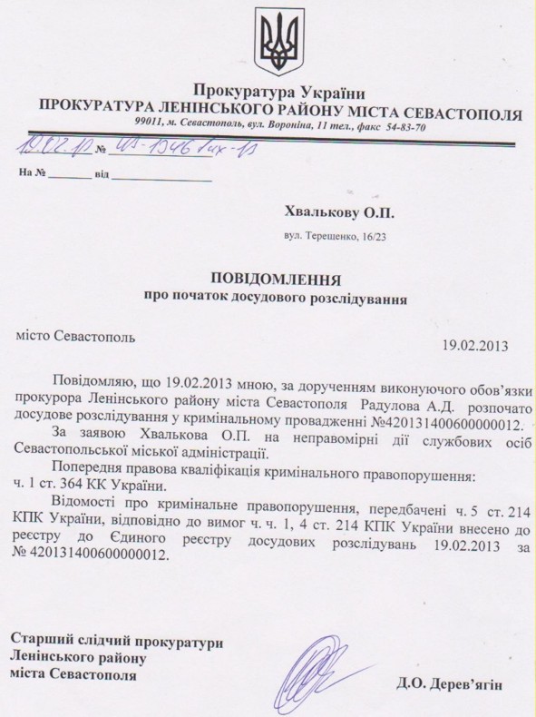 Согласно требованиям УПК Украины заявление о преступлении внесено в Единый реестр досудебных расследований за №420131400600000012, ведутся следственные действия. - так сечас фиксируется любое заявление, согласно новому УПК. Дальше А.Хвальков через месяц получит бумагу о том, что в ходе проверки нарушений не выявлено. И всё на этом.(( Он пожалуется в Генпрокуратуру, оттуда направят в Севастополь и т.д.... Мельница называется...