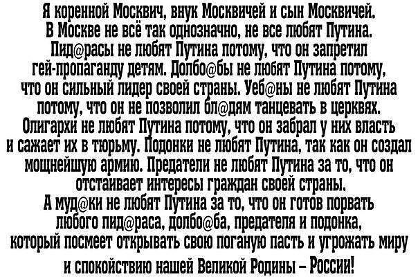 to Voron (Samara) Всё в точку. На каждого "помидора, долбуна, предателя, подонка и прочих ч(м)удаков" не наздравствуешься. У Президента время в дефиците. Даже, если они все откроют свои поганые пасти, им не дано повлиять на благополучие Великой России.