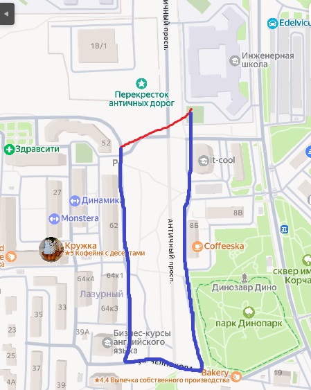 (Яндекс-карты) Прямой путь от домов до Инженерной школы выделен красный цветом, обходной путь — синим цветом