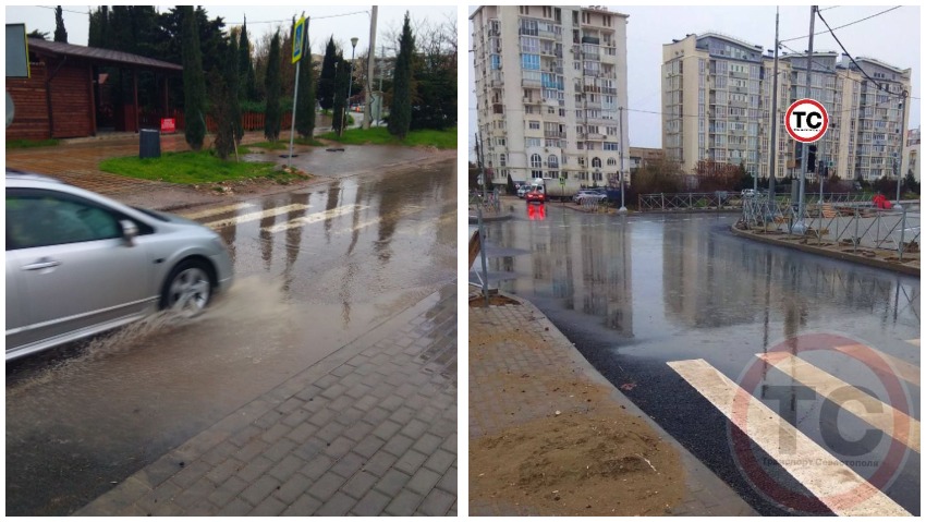 (из телеграм-канала «Наш район» и соцсетей Транспорт Севастополя) Стоящие лужи на новом Античном проспекте