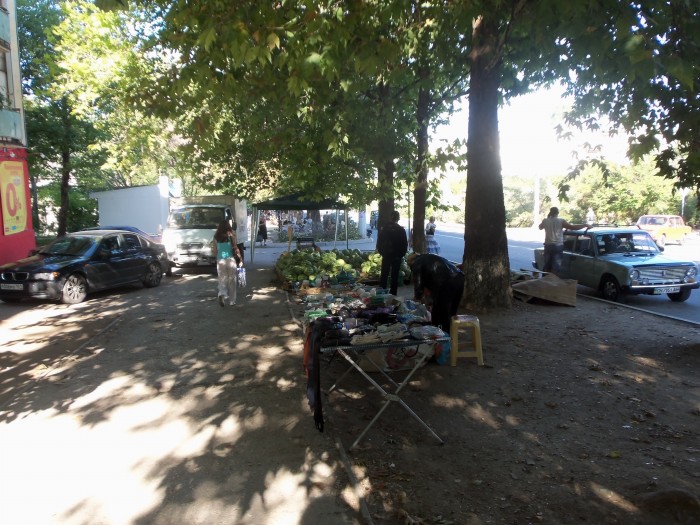 Был газон под дивными платанами. В один миг на него бросают эту бандуру. Рядом в 15 метрах гастроном "Большой Сосед", а через дорогу - старинный гастроном на остановке Героев Подводников. Там точно такие же овощи. Да и сами ВЫ упомянули о близости пл.50-летия ... туда ходят наши хозяйки. А ваш киоск простаивает без покупателей - зайдите в него сами, згляните. А потом прямо с порога поставьте ногу в пыль, а зимой ещё и в грязь!!!