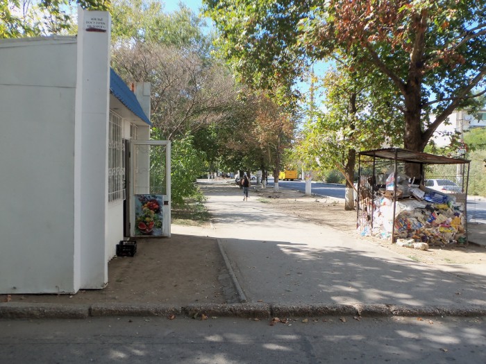 - на фото неизвестно кем установленная выгородка для целофана и макулатуры, причем рядом с тротуаром