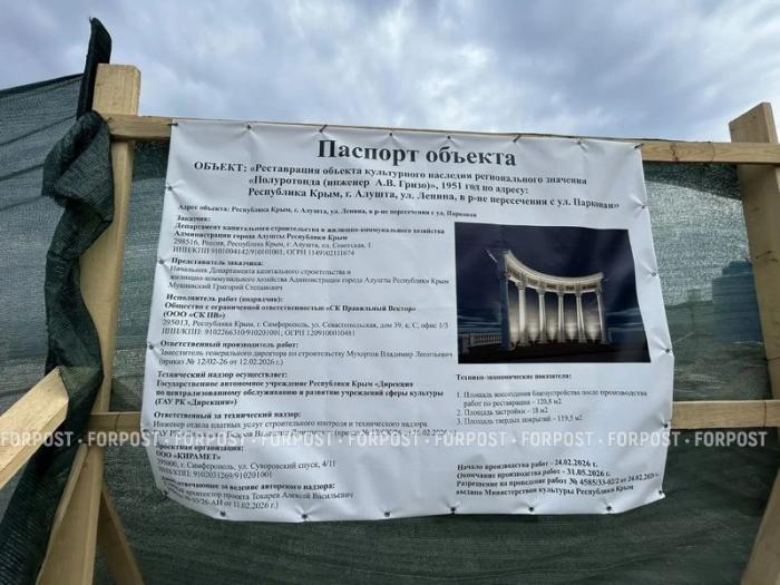 Напомним, полуротонда была построена на набережной Алушты в 1951 году. Со временем архитектурный символ обветшал, и его решили привести в порядок. Как писал ForPost, весной 2025 года ООО «Кирамет» разработало научно-проектную документацию на реставрацию, а в феврале 2026 года ООО «СК Правильный вектор» из Симферополя было определено единым подрядчиком на проведение восстановительных работ.