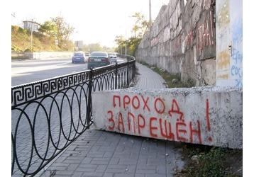 бетонным блоком с надписью "Проезд запрещен". Ведь если стена рухнет, то завалит не только пешеходную дорожку, но и часть дороги с проезжающими автомобилями.
