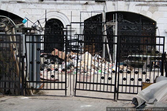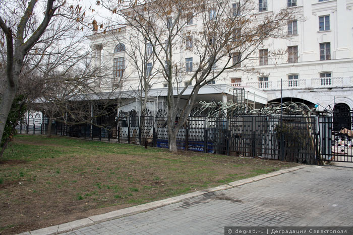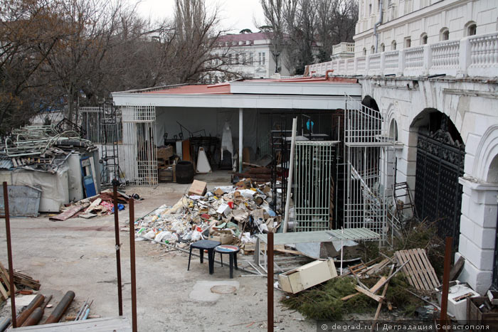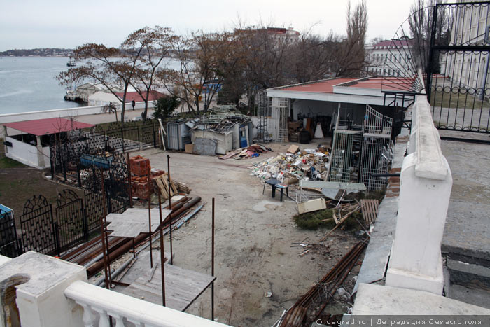 Очевидно, что такой помойке не место в сердце Севастополя. Правильным решением было бы убрать пошлый бар, вывезти мусор, и снести забор, расширив территорию Приморского бульвара.