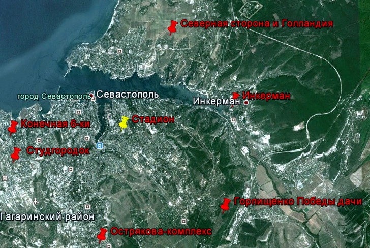 Весь центр города,полностью Стрелецкая вплоть до конечной остановки 6 маршрута и остановки студгородок, район Острякова до остановки "комплекс", районы Горпищенко и Победы с прилегающими дачными кооперативами, Инкерман и Северная сторона с Голландией.