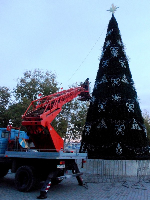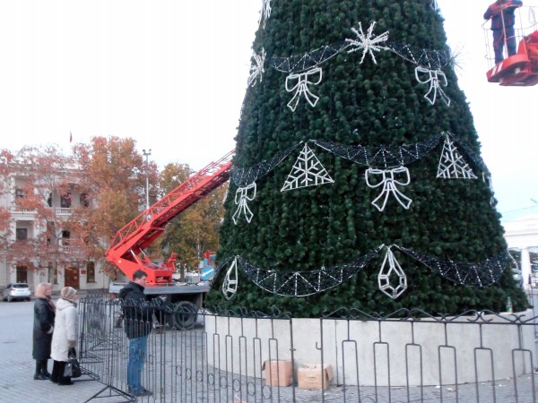 На площади Нахимова наряжают ёлку. Четвертый день даже в выходные делают это работники «ГорСвета» и «СевастопольЭнерго». Во всяком случае, именно их автовышки обеспечивают работы на почти 20-ти метровой высоте. Прежде чем повесить гирлянды и разноцветные шары, предусмотренные в этом году на городской «синтетической красавице», требуется тщательно смонтировать всю электро-часть ёлочной иллюминации.