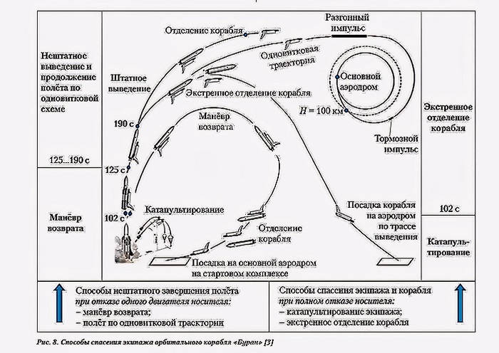 Рассматривались также режимы экстренного отделения орбитального корабля с последующим автономным спуском. Это была серия операций от аварийного выключения отказавшего двигателя до разворота ракеты примерно на 180° — из разряда «развернуть поезд на полном ходу», не потеряв управление и не уничтожив аппарат.