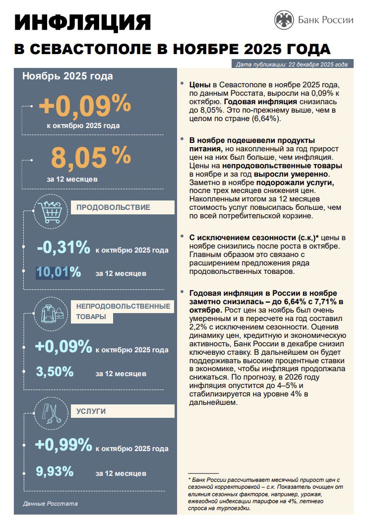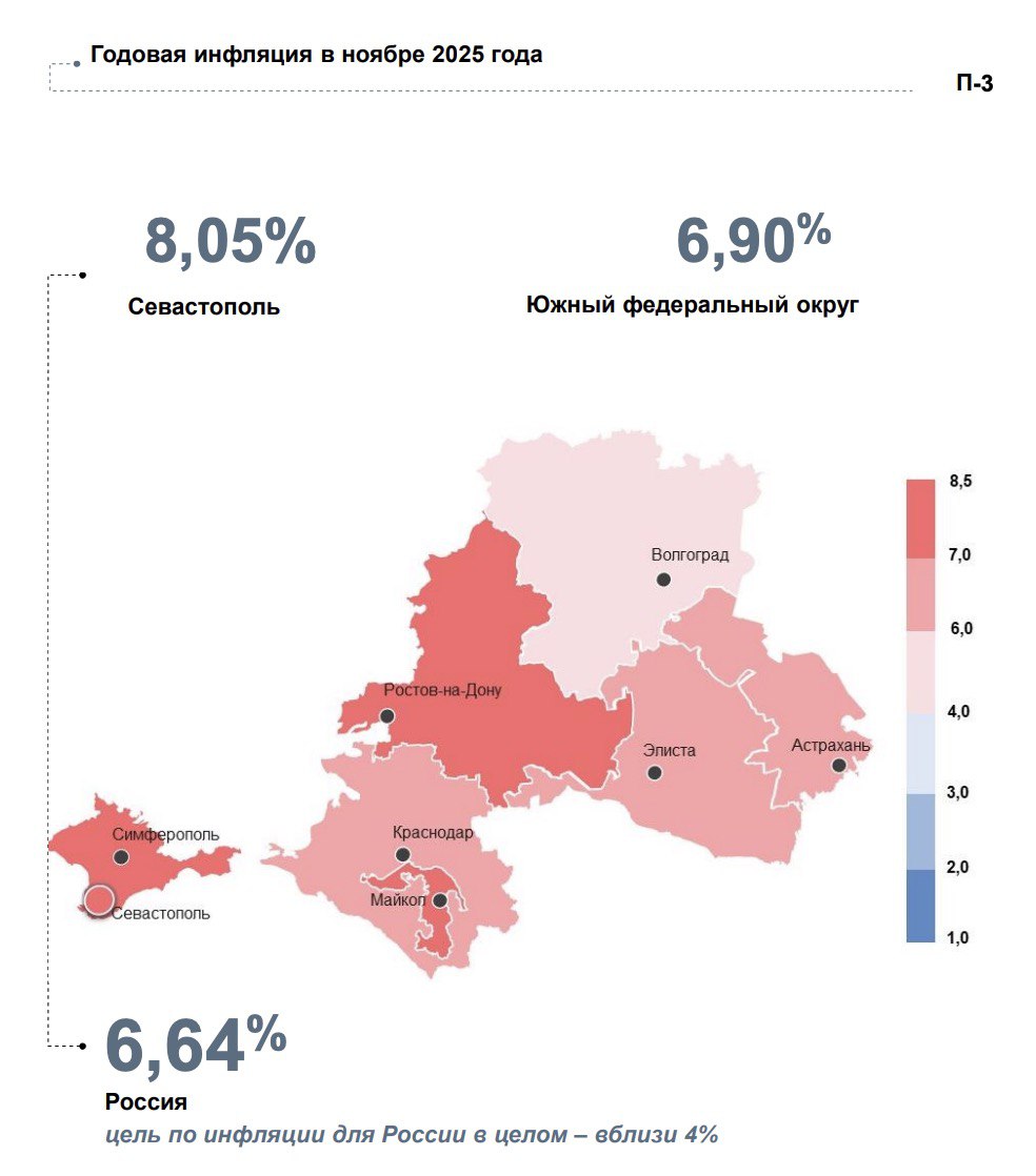 Инфляция в Севастополе остаётся ощутимо выше общероссийской. По стране в ноябре она составила 6,64%, а в Южном федеральном округе — 6,9%. Таким образом, севастопольская инфляция в 8,05% по-прежнему остается выше средней по стране. Экономисты объясняют разницу структурой потребления и более сильным ростом цен в сфере услуг.