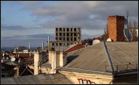 Ну какой идиот согласится жить в такой фигне, хотя бы и в центре Севастополя? - один дом висит над кручей, второй торчит в яме.