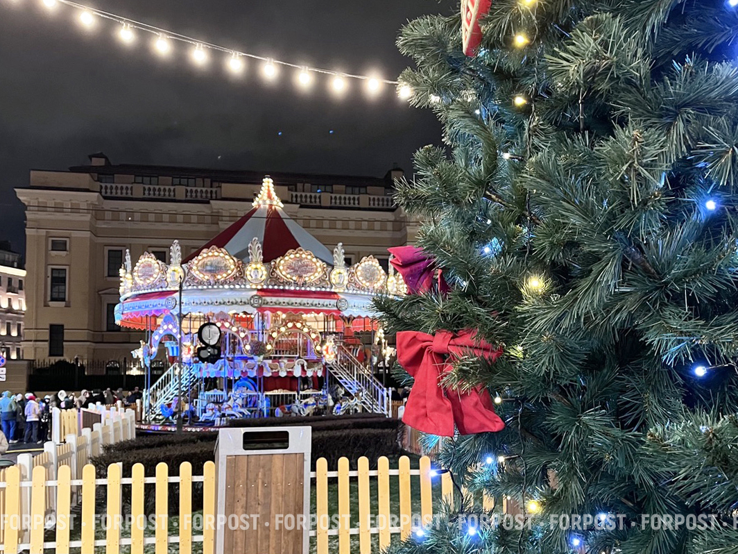 После торговых павильонов открывается вход на ярмарку. Праздничная арка украшена в соответствующей праздничной тематике, а деревья вокруг щедро украшены гирляндами.