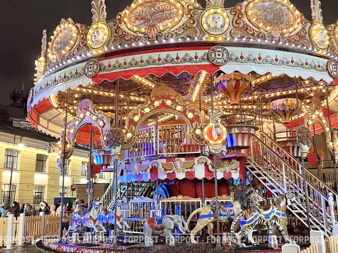 После катка, выпив стаканчик горячего морса, стоит переместиться к двухъярусной карусели в венецианском стиле. Гости могут оседлать не только традиционных лошадей, но и экзотических слонов, жирафов или львов.
