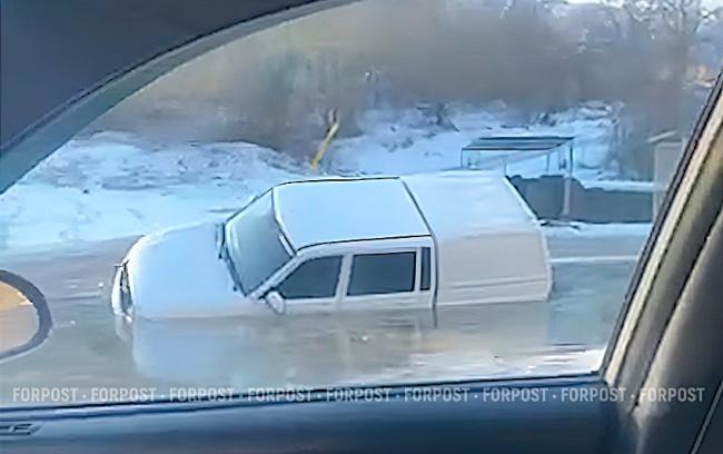 Большая лужа на дороге не вызывает опасений, а по факту — машина проваливается в канаву. Жители села Тылового говорят, что она имеет функцию отвода воды, но, когда она всё-таки разливается на дороге, без предупреждающих знаков или ограждений провалиться довольно легко.