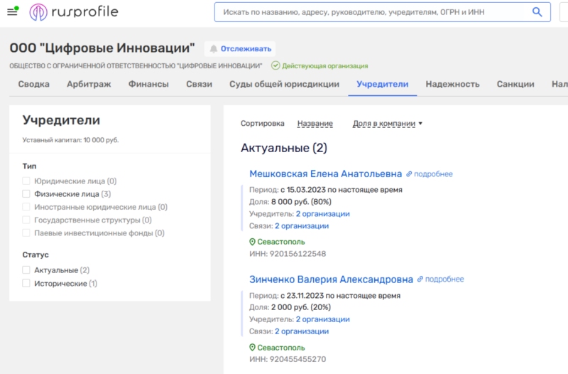 Но и это ещё не всё. Е.А. Мешковская (ИНН 920156122548) является директором ООО «Цифровые инновации». Второй соучредитель «Цифровых инноваций», как ForPost выяснил ранее — это Валерия Зинченко, супруга Кирилла Зинченко, бизнес-партнера упомянутого выше Эдуарда Третьяка.